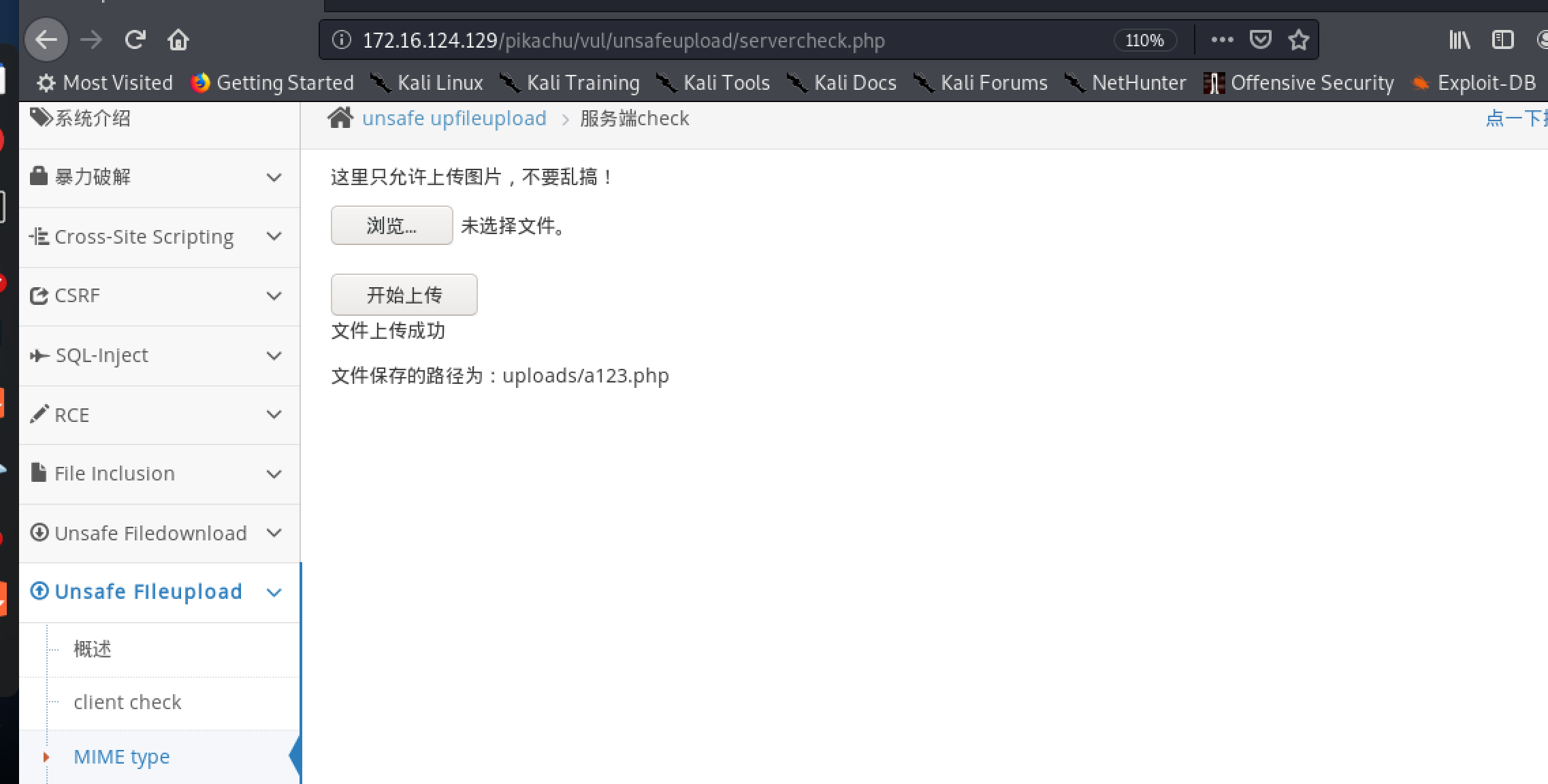 http://172.16.124.129/pikachu/vul/unsafeupload/uploads/a123.php