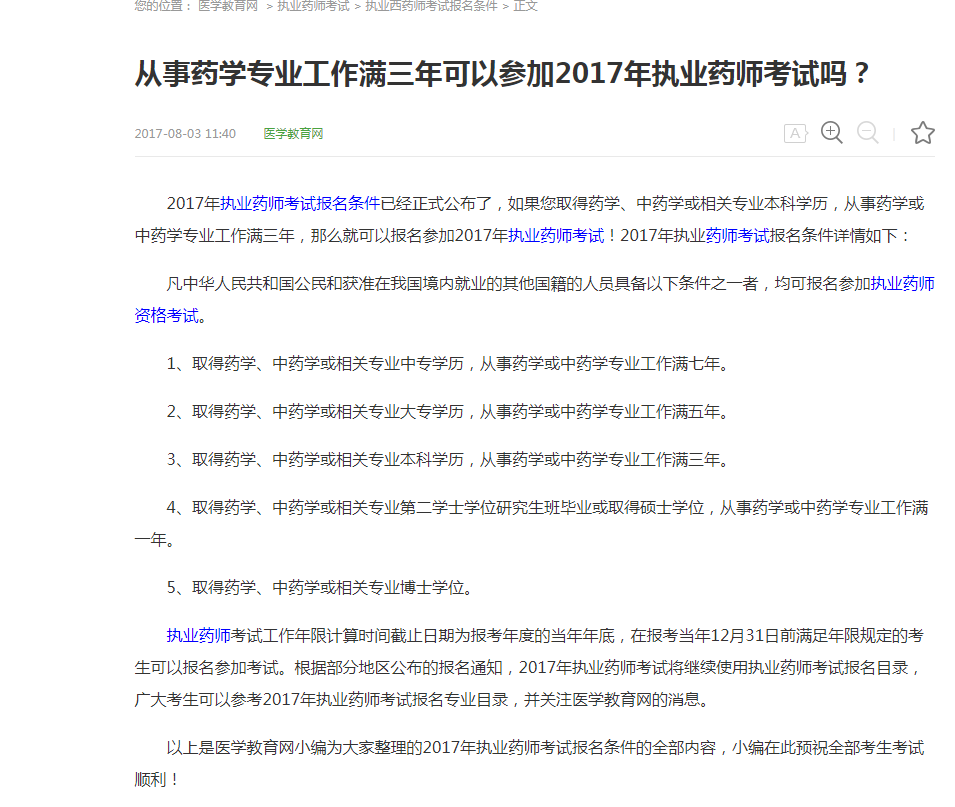 小丽是药学专业的一名本科生,现已从事药学专业的工作,目前她想考取一个资格证,但是报名条件中要求其工作满三年。那么,小丽想考取的是什么证。(请回答并附截图证明。)