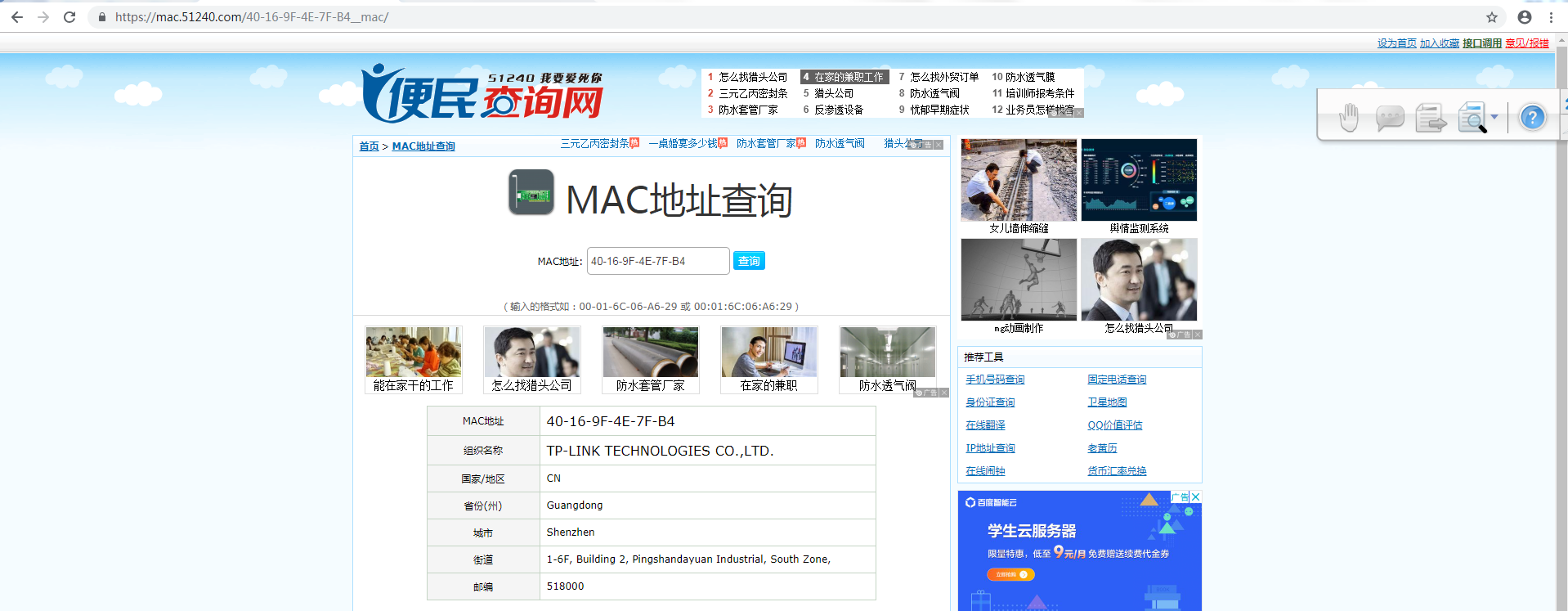 在一个案件中,获取了犯罪嫌疑人的一个MAC地址:40-16-9F-4E-7F-B4,请查询该MAC地址对应的厂商是(附截图)
