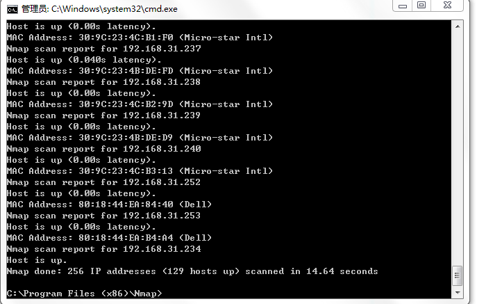 请查询本机的IP地址和子网掩码,并在局域网中扫描本网段内的所有存活主机(附搜索截图)