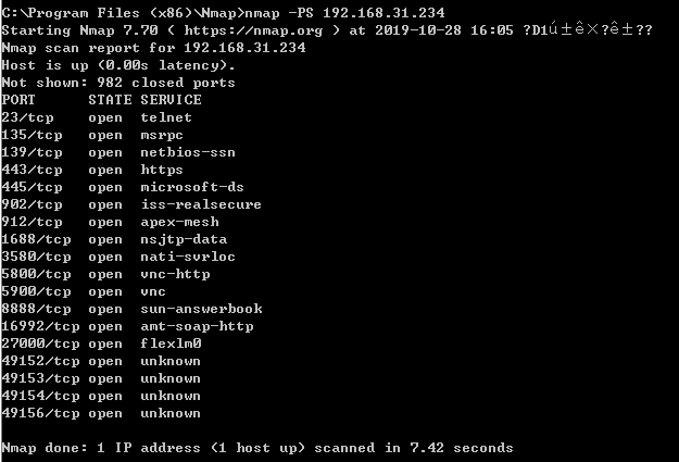 选择一个存活IP地址,扫描所开放的端口(分别用ping扫描,syn扫描尝试),并查询常用端口所对应的服务及操作系统信息。