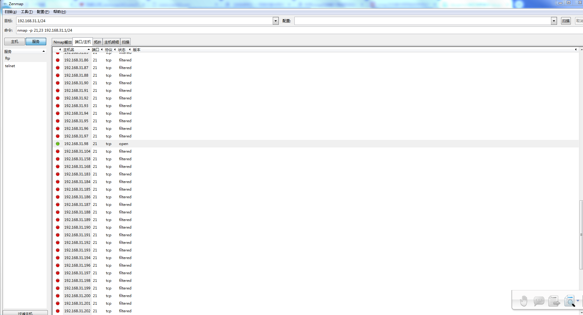 在实验楼上网的局域网内,请扫描出来,哪些机器开启了ftp服务,哪些机器开启了远程桌面连接服务,并附截图证明。