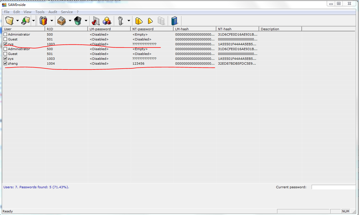 起初密码复杂破解结果为????,再添加一个用户设置简单密码得到破解密码。