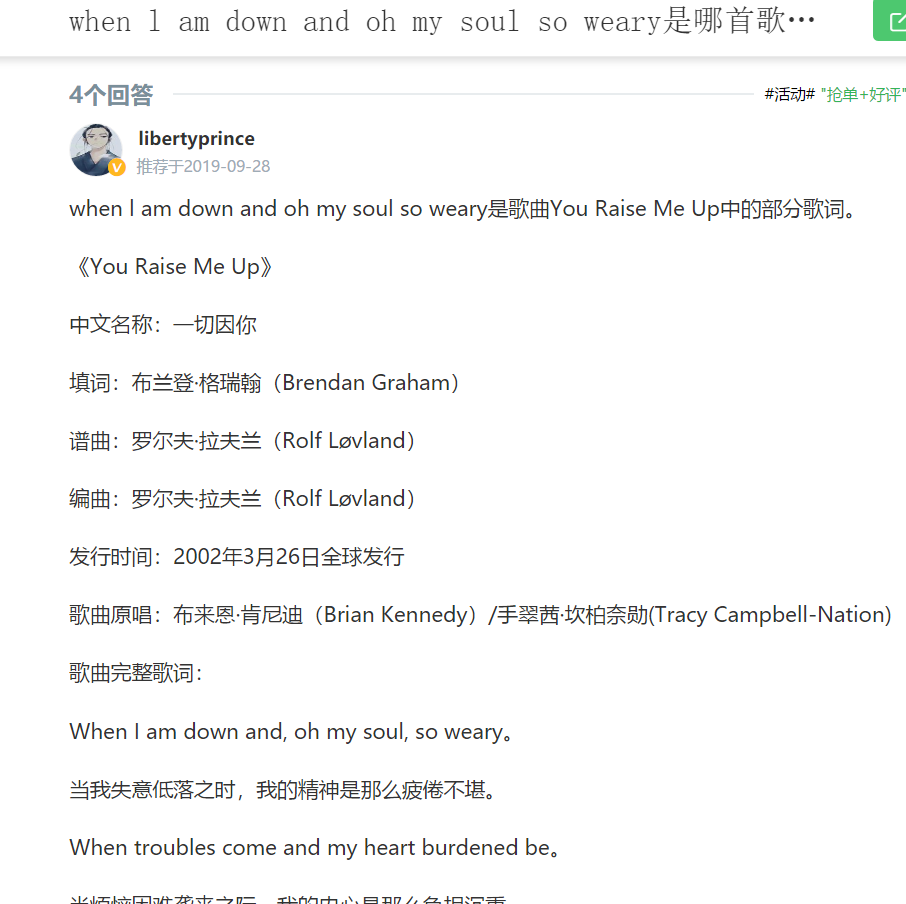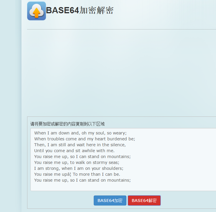 V2hlbiBJIGFtIGRvd24gYW5kLCBvaCBteSBzb3VsLCBzbyB3ZWFyeTsKV2hlbiB0cm91YmxlcyBjb21lIGFuZCBteSBoZWFydCBidXJkZW5lZCBiZTsKVGhlbiwgSSBhbSBzdGlsbCBhbmQgd2FpdCBoZXJlIGluIHRoZSBzaWxlbmNlLApVbnRpbCB5b3UgY29tZSBhbmQgc2l0IGF3aGlsZSB3aXRoIG1lLgpZb3UgcmFpc2UgbWUgdXAsIHNvIEkgY2FuIHN0YW5kIG9uIG1vdW50YWluczsKWW91IHJhaXNlIG1lIHVwLCB0byB3YWxrIG9uIHN0b3JteSBzZWFzOwpJIGFtIHN0cm9uZywgd2hlbiBJIGFtIG9uIHlvdXIgc2hvdWxkZXJzOwpZb3UgcmFpc2UgbWUgdXDigKYgVG8gbW9yZSB0aGFuIEkgY2FuIGJlLgpZb3UgcmFpc2UgbWUgdXAsIHNvIEkgY2FuIHN0YW5kIG9uIG1vdW50YWluczs=