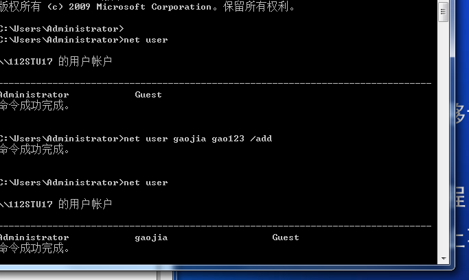 1.在windows xp系统中使用 net user gao gao123 /add添加用户gao,密码gao123的账户(用户名和密码可以自己设定);并使用net user命令确定用户添加成功。