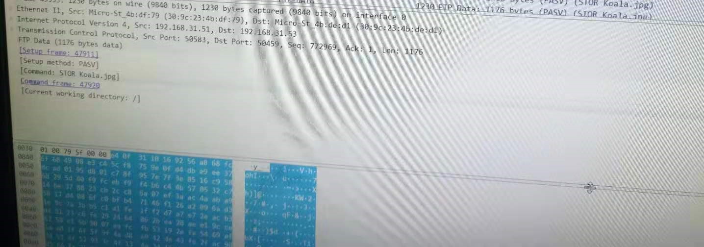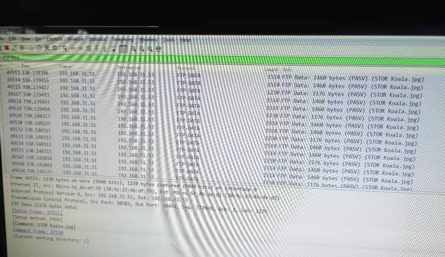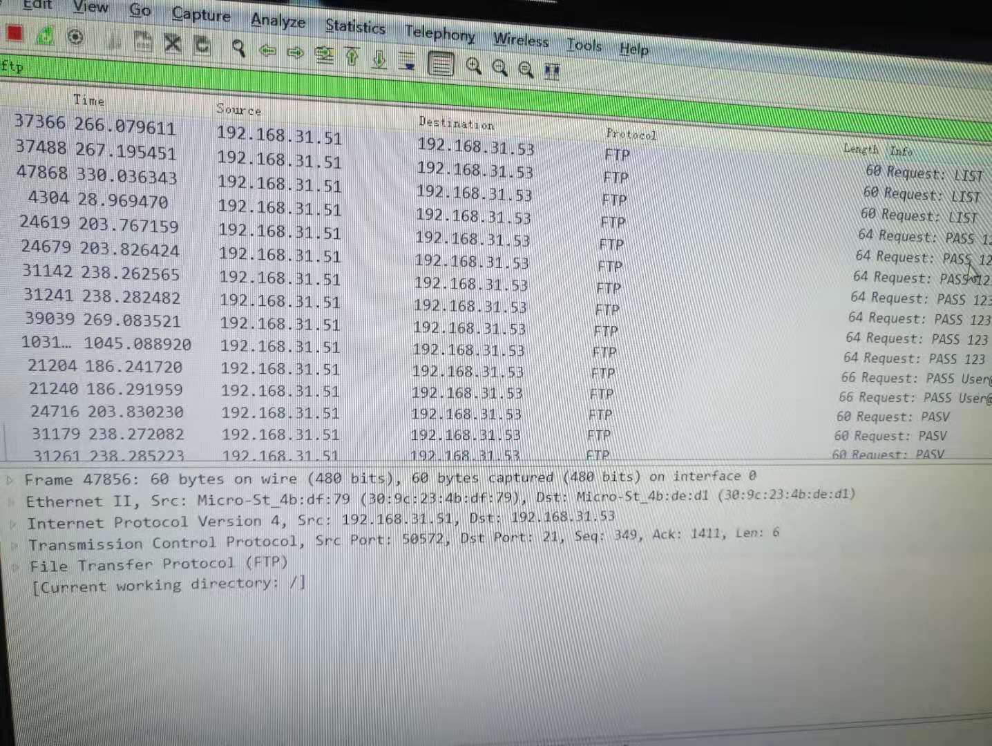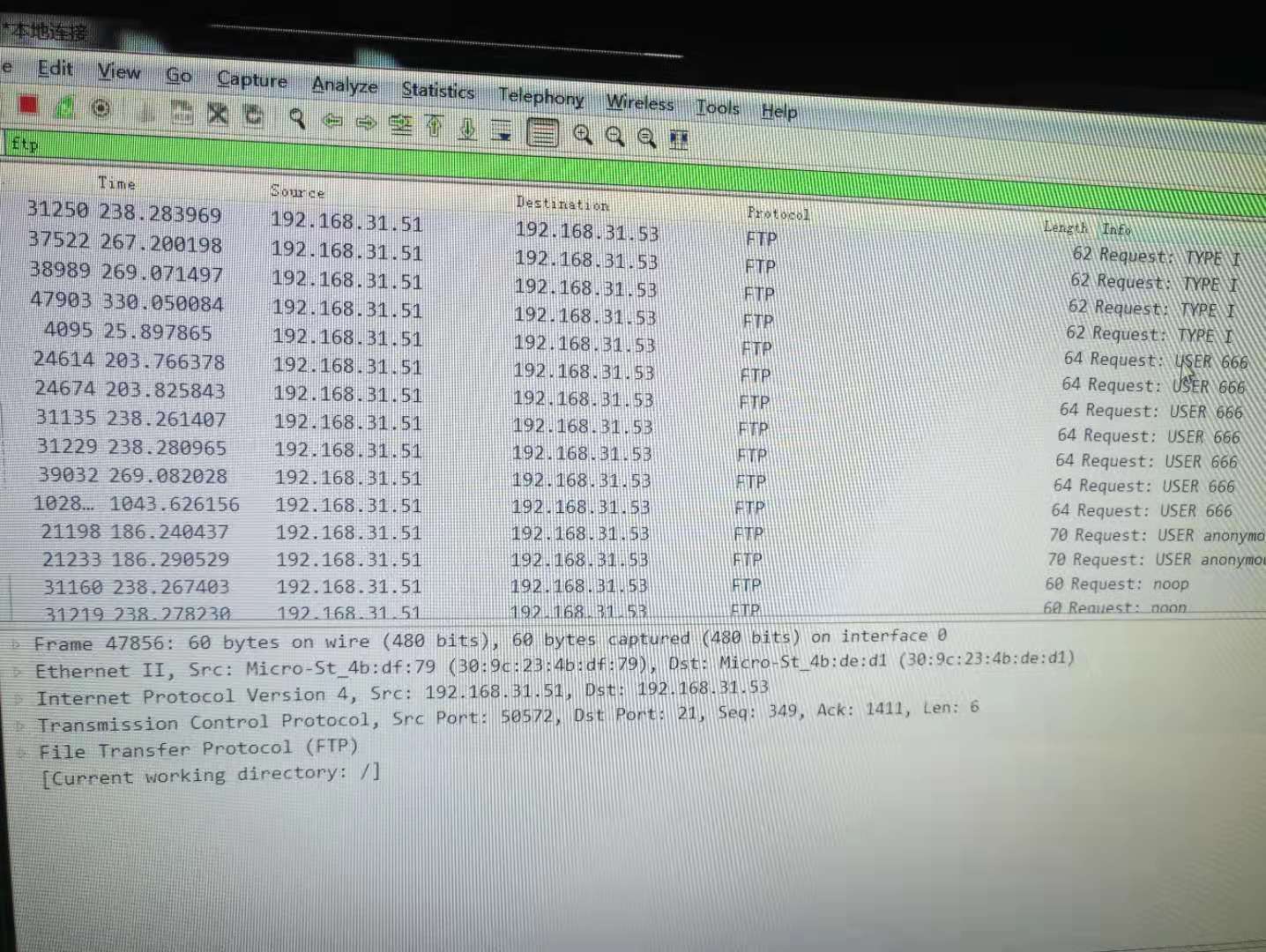 用192.168.31.52打开wireshark并进行访问、抓包。对抓取的数据包进行分析。过滤出与ftp有关的数据包。