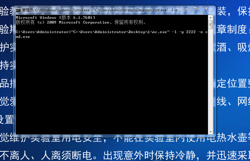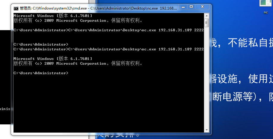 nc.exe -l -p port -e cmd.exe 进入监听模式