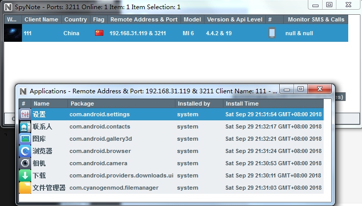 可以在spynote中看到有一台机器上线,并可以查看其基本信息。