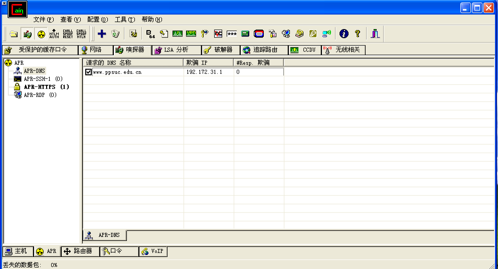 3.B同学扮演攻击者,设计攻击方法,使用CAIN,通过DNS欺骗的方式,让A同学访问www.ppsuc.edu.cn网址的时候,访问到另外一台机器上的伪造网站