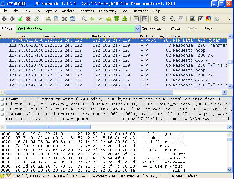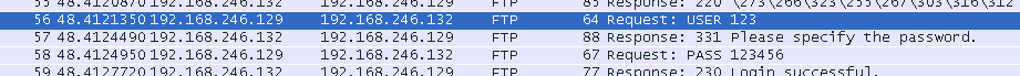 用192.168.246.129打开wireshark并进行访问、抓包。对抓取的数据包进行分析。过滤出与ftp有关的数据包。