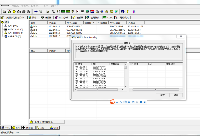 4、点击工具栏第三个图标(start ARP)就可以ARP欺骗了