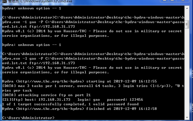 2.B同学使用hydra 对ftp用户的密码进行字典破解。hydra 中有关于该软件的使用命令语法。字典文件需要自己去生成。