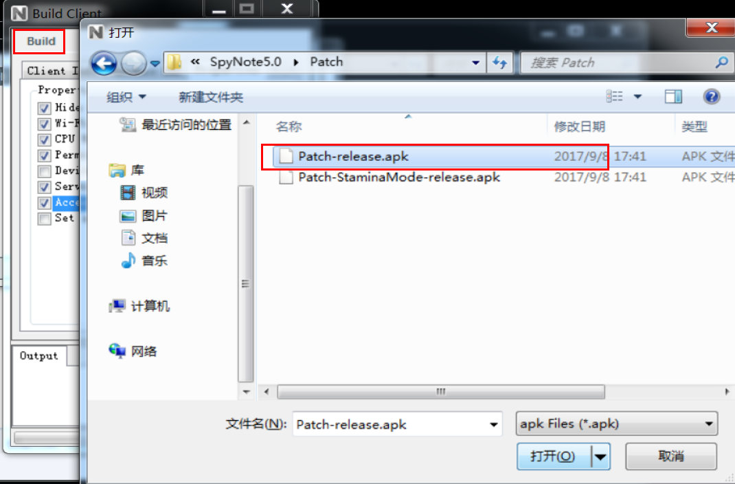 (4)最后点击Build按钮,在选择框中选择和spynote同处在一个文件夹中Patch-release.apk。