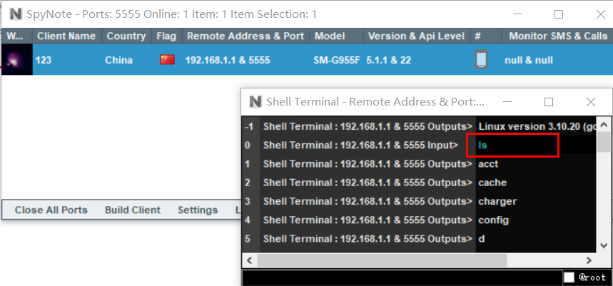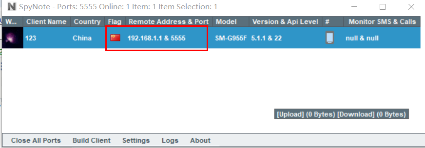 可以在spynote中看到有一台机器上线,并可以查看其基本信息。