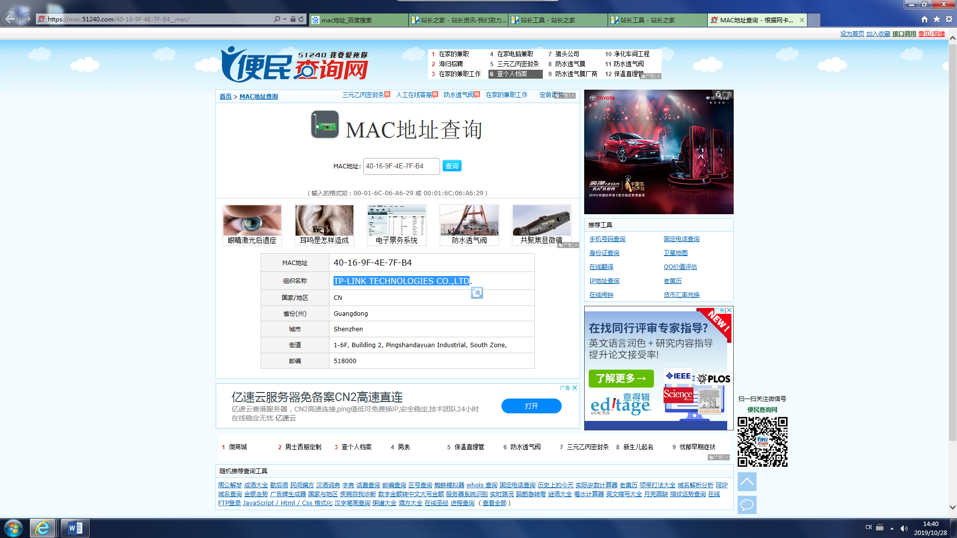 在一个案件中,获取了犯罪嫌疑人的一个MAC地址:40-16-9F-4E-7F-B4,请查询该MAC地址对应的厂商是(附截图)