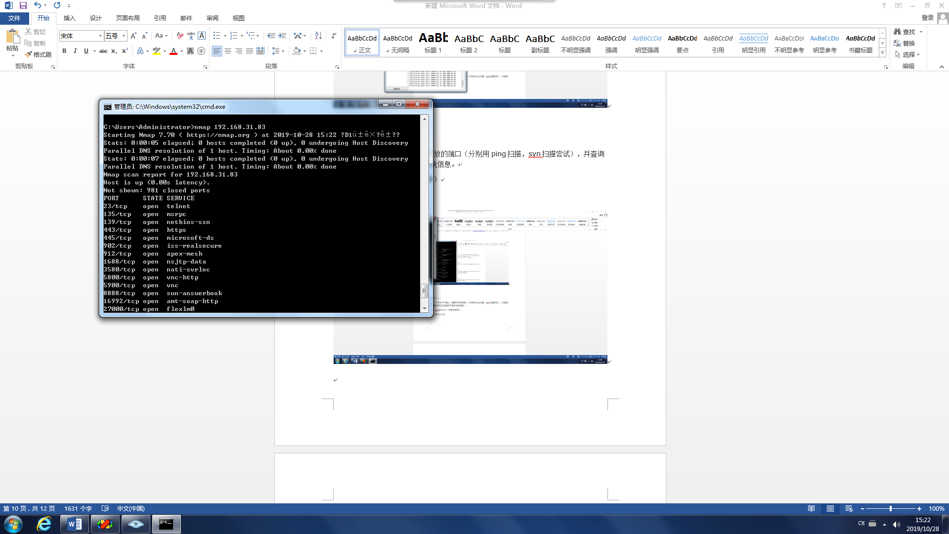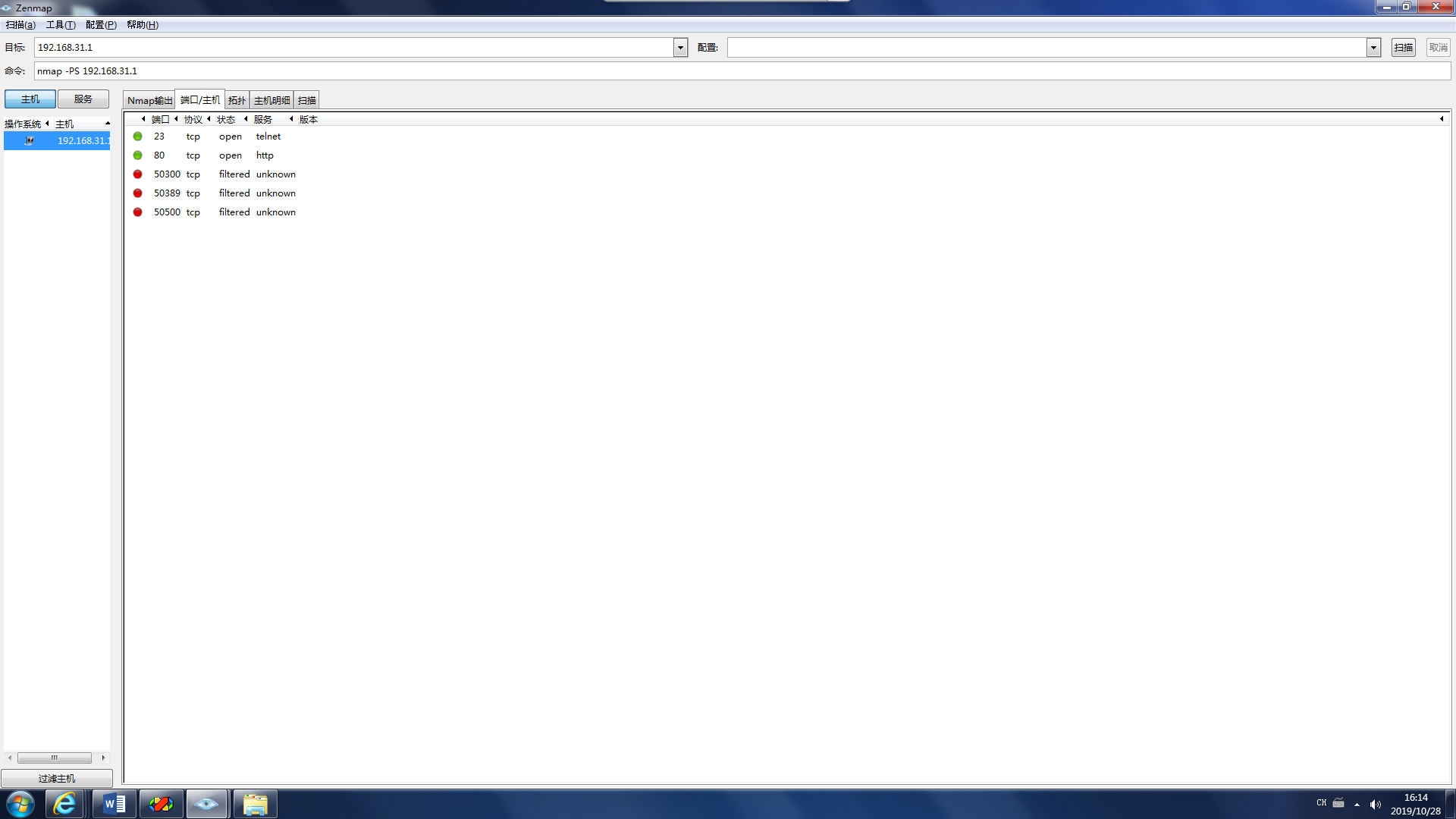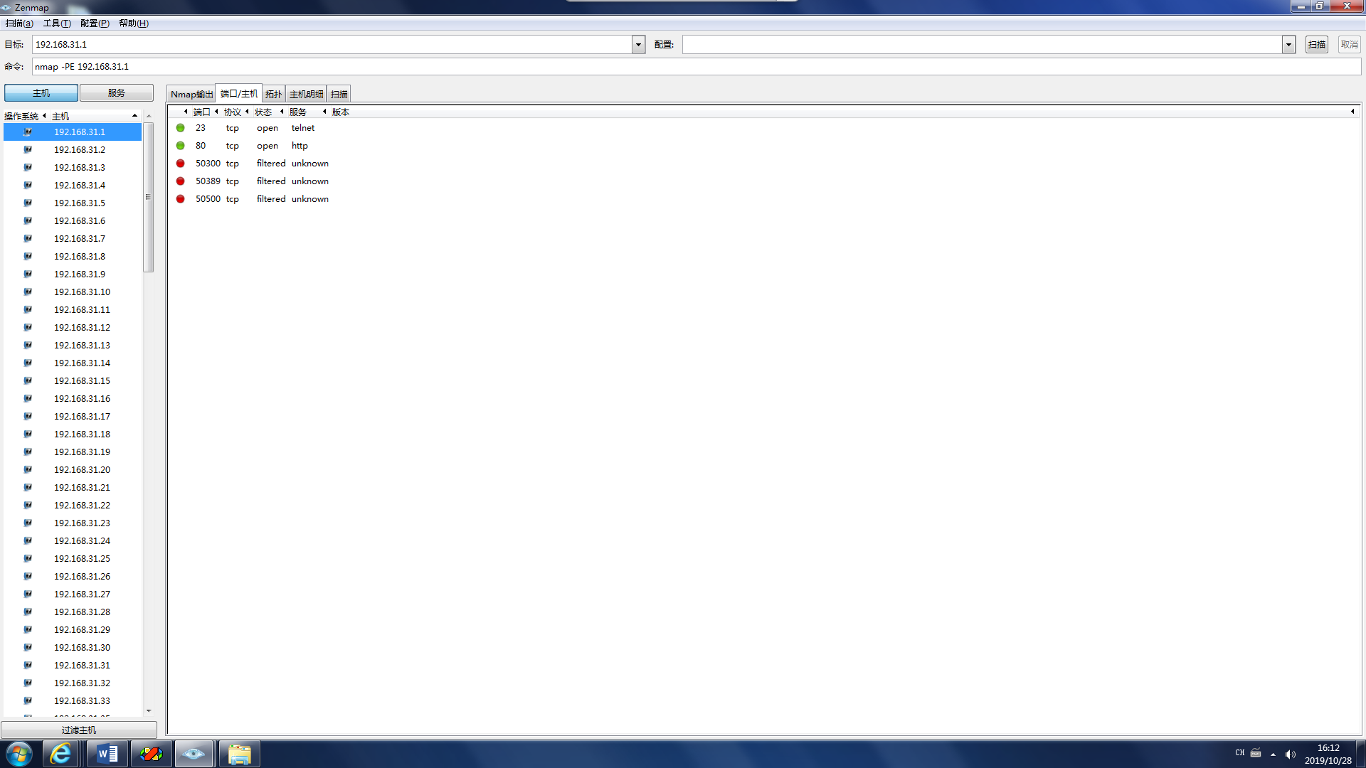 选择一个存活IP地址,扫描所开放的端口(分别用ping扫描,syn扫描尝试),并查询常用端口所对应的服务及操作系统信息。