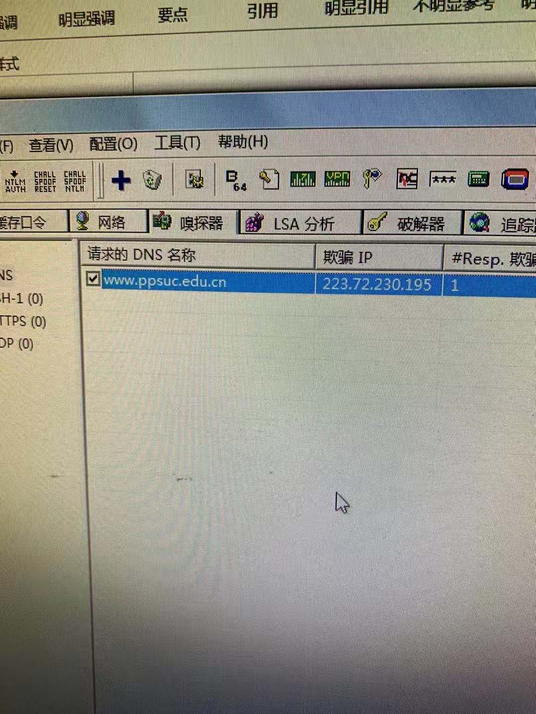 3.B同学扮演攻击者,设计攻击方法,使用CAIN,通过DNS欺骗的方式,让A同学访问www.ppsuc.edu.cn网址的时候,访问到另外一台机器上的伪造网站