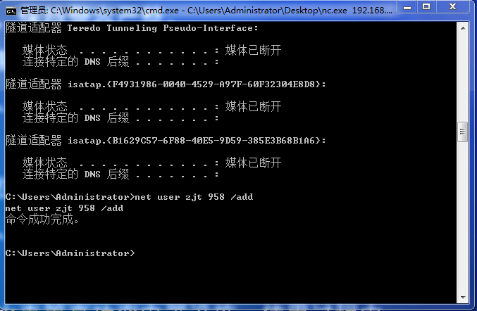 在shell中,利用net user 用户名 密码 /add ,添加一个用户,并在受害者的机器中使用 net user 命令进行验证。