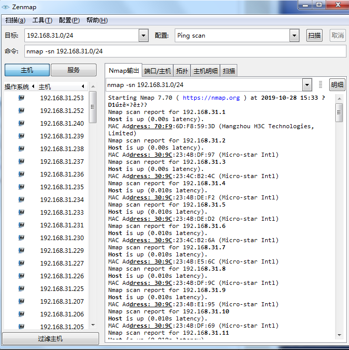 请查询本机的IP地址和子网掩码,并在局域网中扫描本网段内的所有存活主机(附搜索截图)