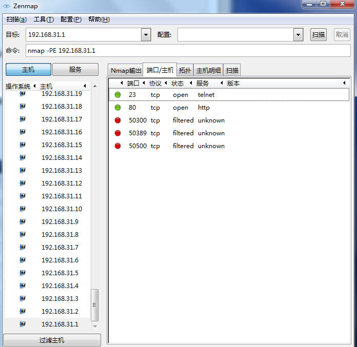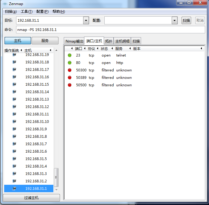 选择一个存活IP地址,扫描所开放的端口(分别用ping扫描,syn扫描尝试),并查询常用端口所对应的服务及操作系统信息。