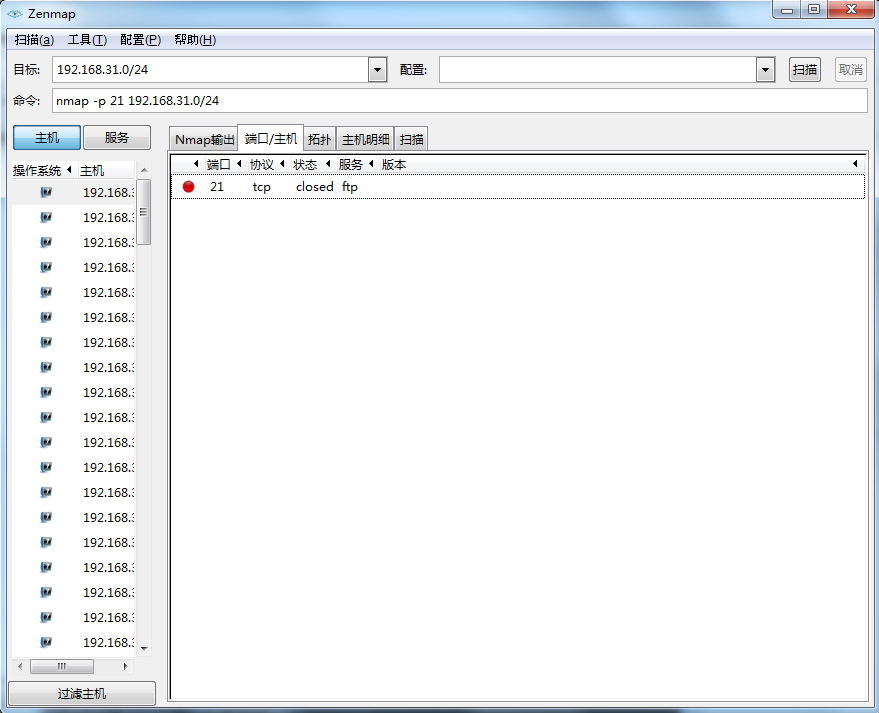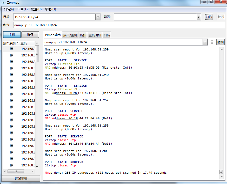 在实验楼上网的局域网内,请扫描出来,哪些机器开启了ftp服务,哪些机器开启了远程桌面连接服务,并附截图证明。