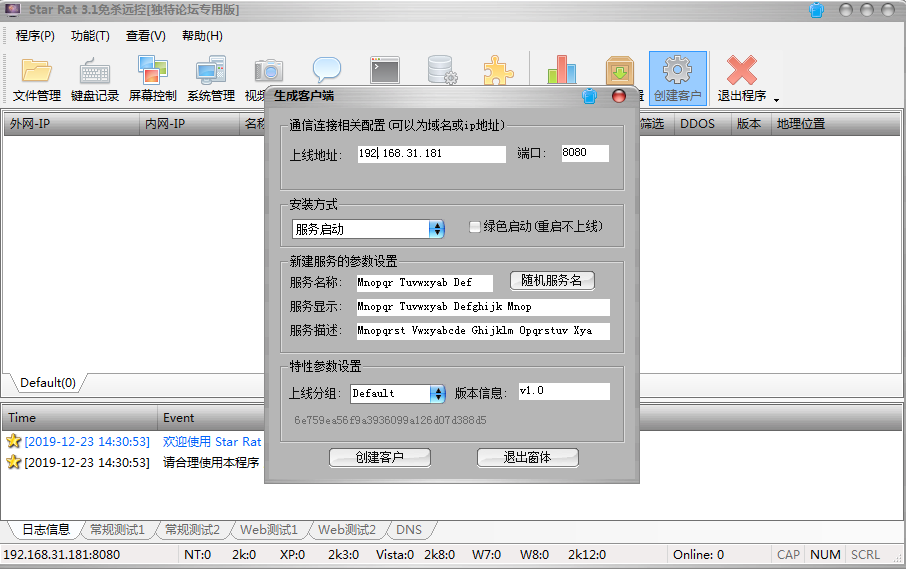 点击菜单栏中的“服务生成”,在弹出的配置服务端中,配置回连IP地址(攻击者IP)和端口号,并点击“生成”按钮,生成木马服务端。