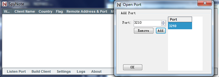 点击Listen Port,在弹出的对话框中输入端口号,并点击Add按钮,最后点击OK,成功监听本地端口。【本过程选用3210端口,实验过程大家可以自己选择端口】