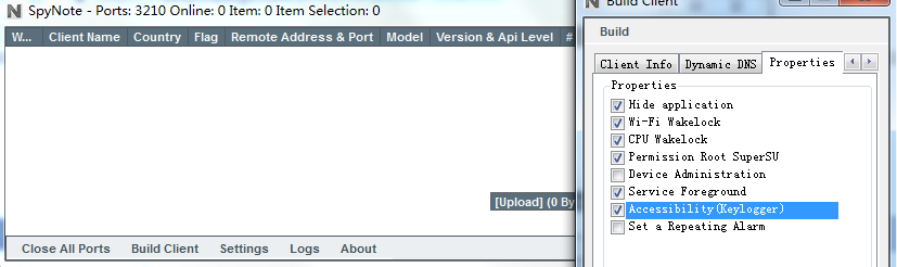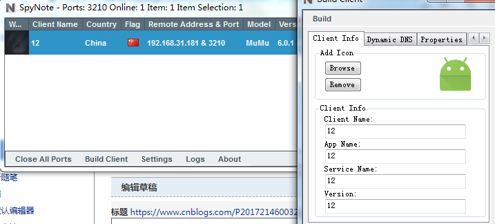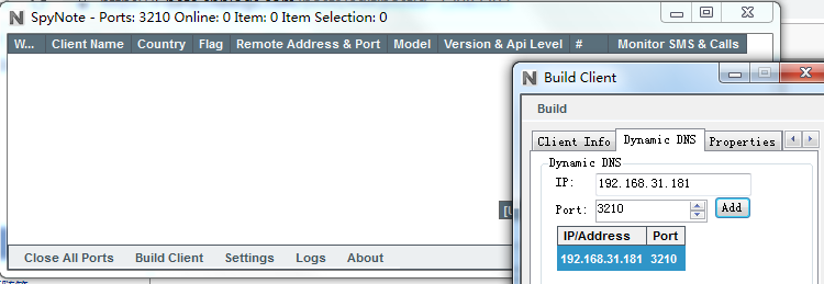 (2)配置回连IP和端口,IP地址填写运行spynote的机器IP,端口填写监听的端口号,本次填写3210端口。