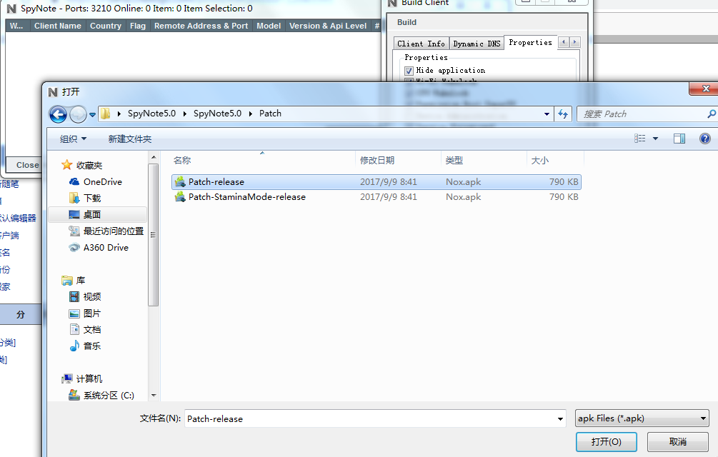 (4)最后点击Build按钮,在选择框中选择和spynote同处在一个文件夹中Patch-release.apk。