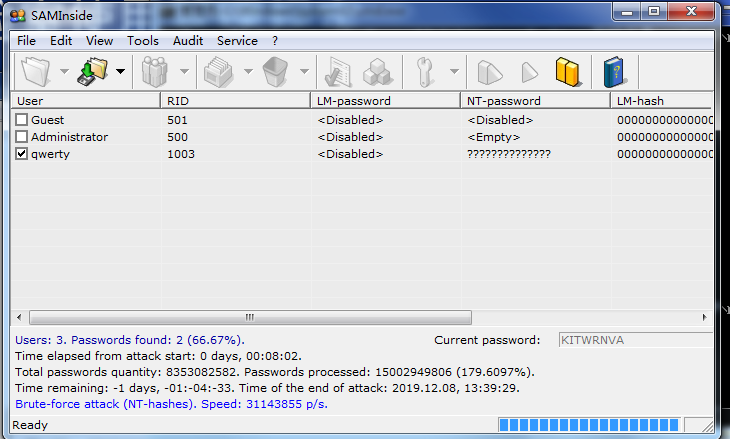 3.使用saminside软件将sam.txt导入,并进行破解,注意配置字典破解和暴力破解