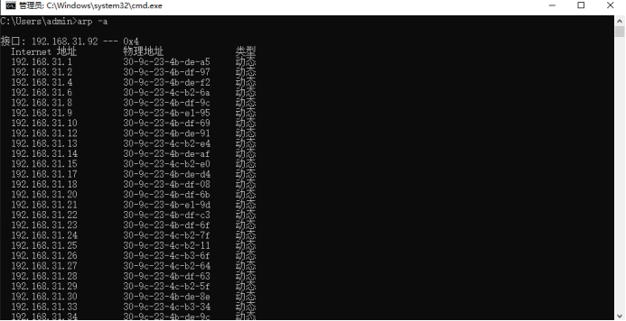 下图为欺骗开始后在192.168.31.92机器上用arp –a命令查询本机arp缓存表的情况,会发现缓存表中的网关对应的MAC地址变成了192.168.31.94号机(实施ARP欺骗的机器)的IP地址