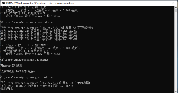 欺骗成功后,在被害机器上查看www.ppsuc.edu.cn的IP 查看是否被解析到了,指定的IP地址上。