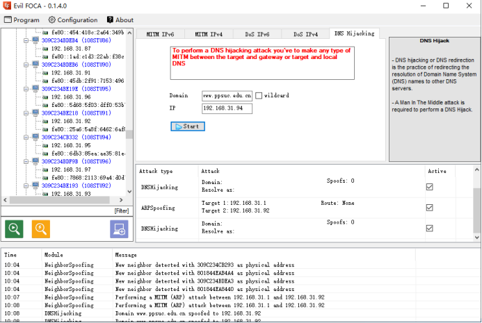 3.B同学扮演攻击者,设计攻击方法,使用CAIN,通过DNS欺骗的方式,让A同学访问www.ppsuc.edu.cn网址的时候,访问到另外一台机器上的伪造网站