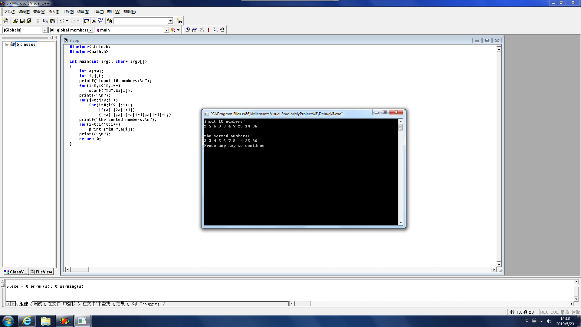 int main(int argc, char* argv[]) { int a[10]; int i,j,t; printf("input 10 numbers:\n"); for(i=0;i<10;i++) scanf("%d",&a[i]); printf("\n"); for(j=0;j<9;j++) for(i=0;i<9-j;i++) if(a[i]>a[i+1]) {t=a[i];a[i]=a[i+1];a[i+1]=t;} printf("the sorted numbers:\n"); for(i=0;i<10;i++) printf("%d ",a[i]); printf("\n"); return 0; }