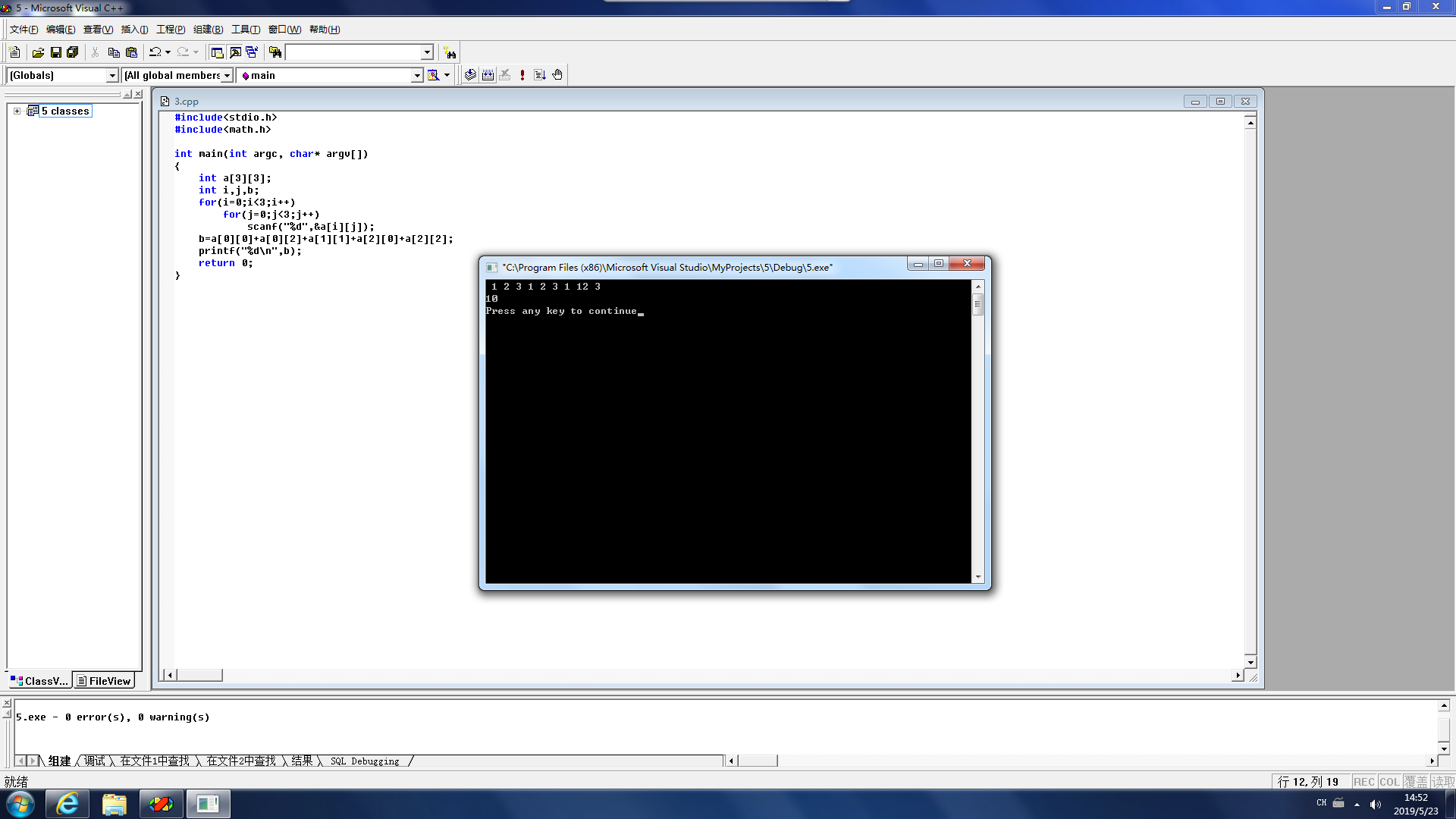 int main(int argc, char* argv[]) { int a[3][3]; int i,j,b; for(i=0;i<3;i++) for(j=0;j<3;j++) scanf("%d",&a[i][j]); b=a[0][0]+a[0][2]+a[1][1]+a[2][0]+a[2][2]; printf("%d\n",b); return 0; }