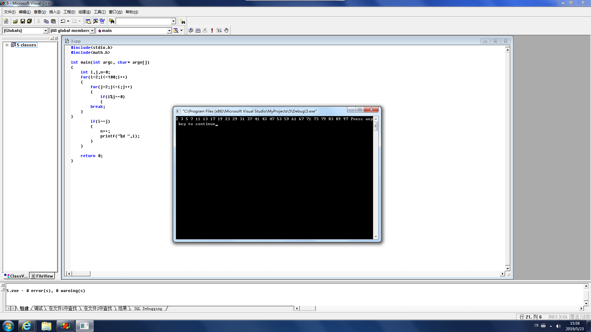 int main(int argc, char* argv[]) { int i,j,n=0; for(i=2;i<=100;i++) { for(j=2;j<=i;j++) { if(i%j==0) { break; } } if(i==j) { n++; printf("%d ",i); } } return 0; }