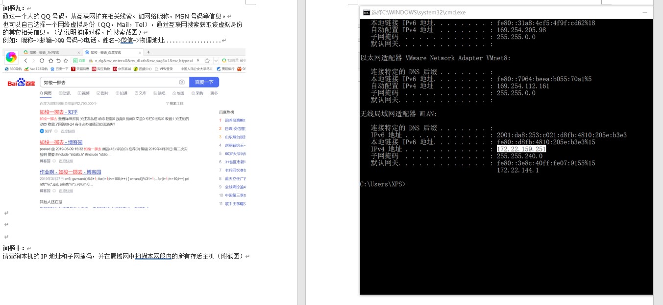 请查询本机的IP地址和子网掩码,并在局域网中扫描本网段内的所有存活主机(附截图)