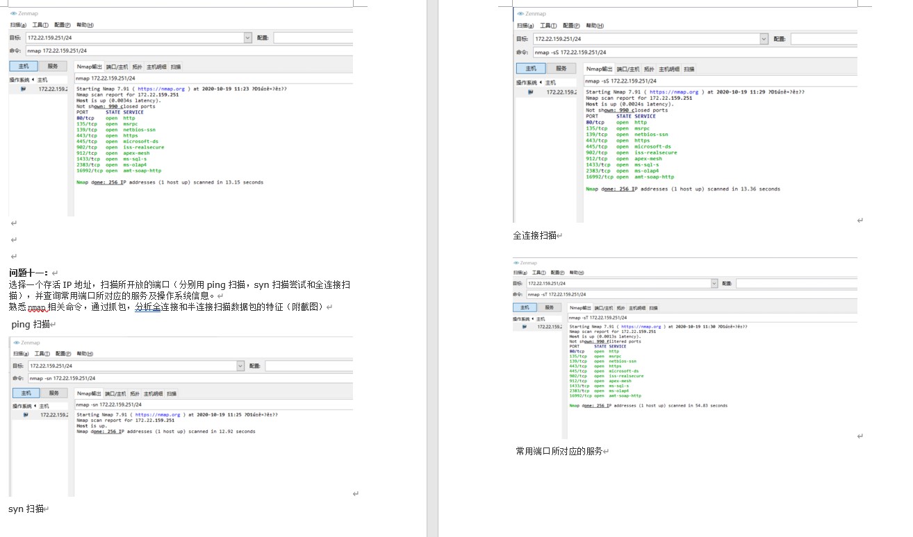 选择一个存活IP地址,扫描所开放的端口(分别用ping扫描,syn扫描尝试和全连接扫描),并查询常用端口所对应的服务及操作系统信息。