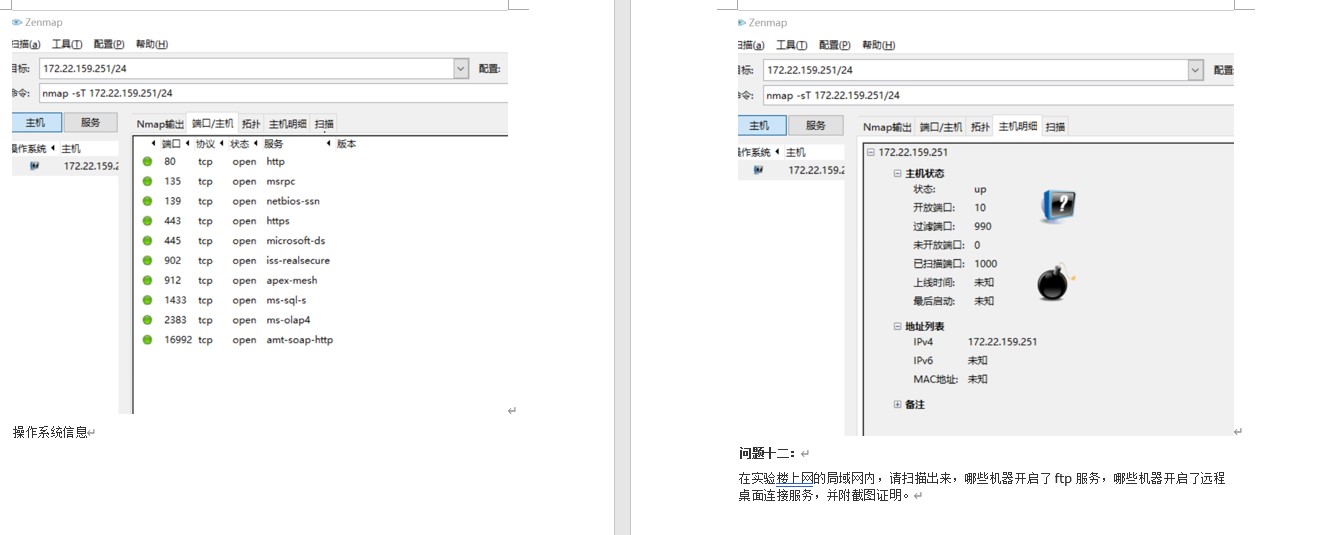 在实验楼上网的局域网内,请扫描出来,哪些机器开启了ftp服务,哪些机器开启了远程桌面连接服务,并附截图证明。
