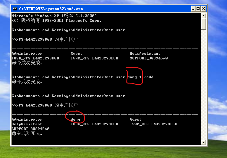 1.在windows xp系统中使用 net user gao gao123 /add添加用户dong,密码1的账户(用户名和密码可以自己设定);并使用net user命令确定用户添加成功。