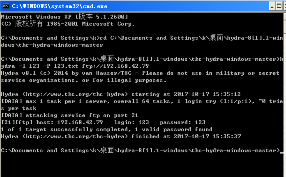 2.B同学使用hydra 对ftp用户的密码进行字典破解。hydra 中有关于该软件的使用命令语法。字典文件需要自己去生成。