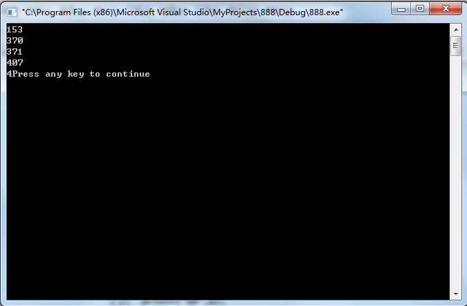 int main(int argc, char* argv[]) {int a,b,c,n,q; q=0; for(n=100;n<1000;n++) { a=n/100; b=n/10%10; c=n%10; if(n==a*a*a+b*b*b+c*c*c) {printf("%d\n",n); q++; } } printf("%d",q); return 0; }