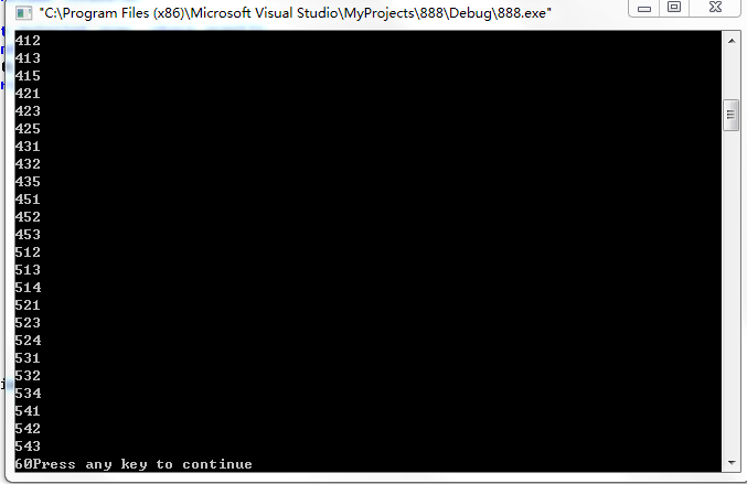int main(int argc, char* argv[]) {int a,b,c,s,q; q=0; for(a=1;a<6;a++) { for(b=1;b<6;b++) { for(c=1;c<6;c++) { if(a!=b&&b!=c&&a!=c) { s=a*100+b*10+c; { printf("%d\n",s); q++; } } } } } printf("%d",q); return 0; }